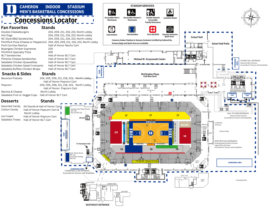 Cameron Indoor Stadium offers a variety of food options and Coca-Cola products, provided by Proof of the Pudding. Concession stands are located: